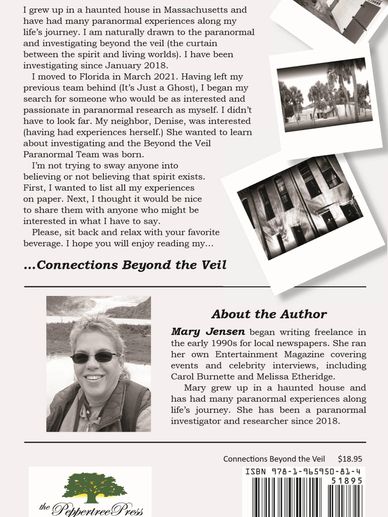 Mary Jensen has had spirits around her entire life. In Connections Beyond the Veil, she takes you from growing up in a haunted house to becoming a paranormal investigator and all the craziness in between.